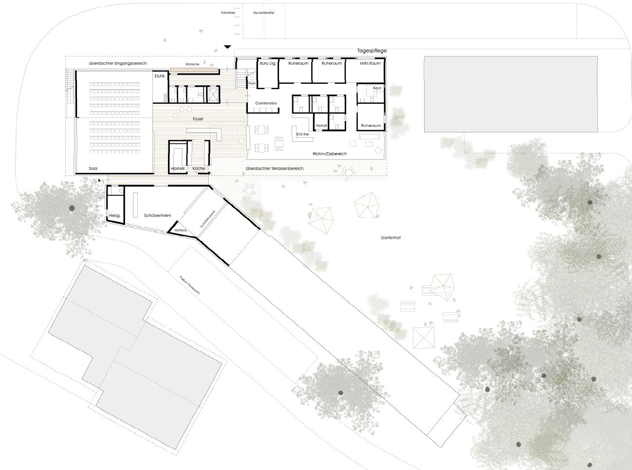 Geplant sind unter anderem ein Veranstaltungssaal, eine Tagespflege, Büroflächen für Kleinunternehmen sowie eine Physiotherapie- und Fußpflegepraxis. Zudem wird das bestehende Schützenheim in den Neubau integriert, wobei die Schießanlage erhalten bleibt.