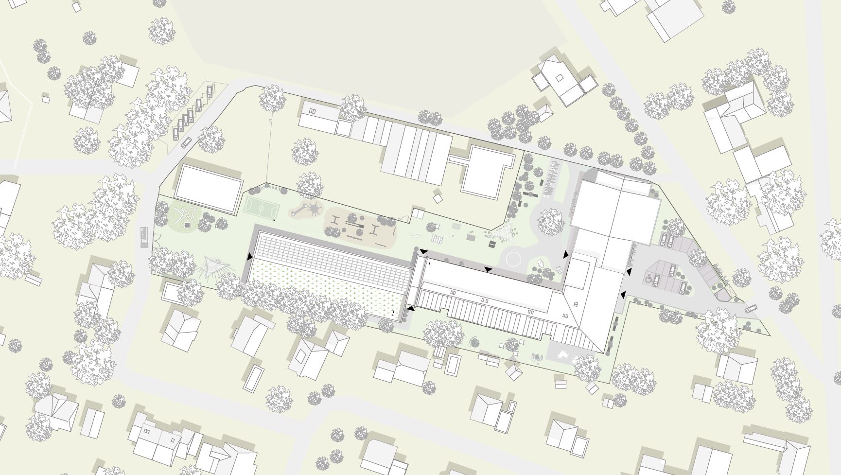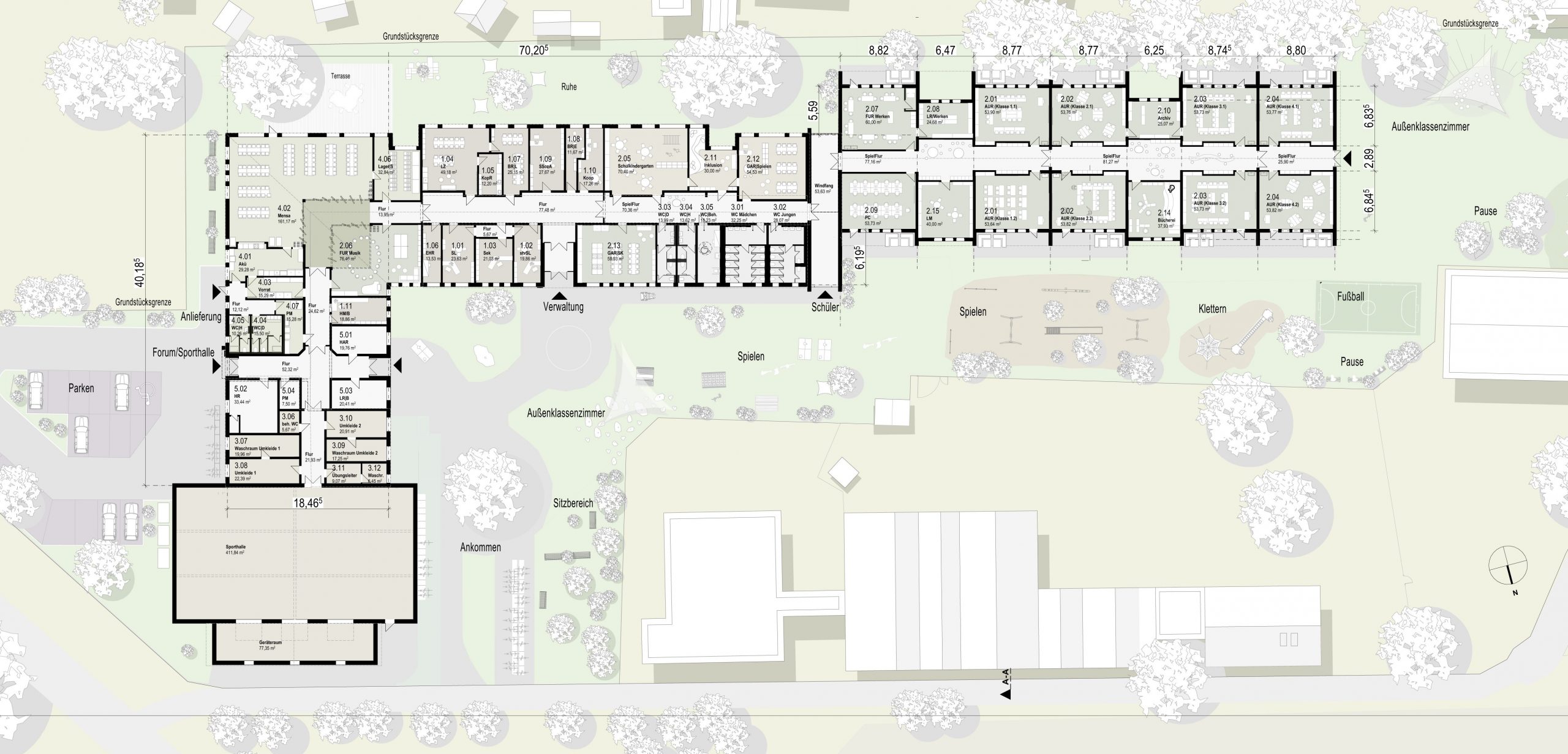 Auf dem bestehenden Schulgelände sollen rund 850 Quadratmeter zusätzliche Nutzfläche entstehen. Geplant sind eine Mensa mit angeschlossener Küche, neue Unterrichts- und Gruppenräume, Verwaltungs- und Nebenräume. Ziel ist es, den zusätzlichen Raumbedarf für einen ganztägigen Schulbetrieb abzudecken und dabei moderne, energieeffiziente und wirtschaftlich umsetzbare Baukonzepte zu realisieren.