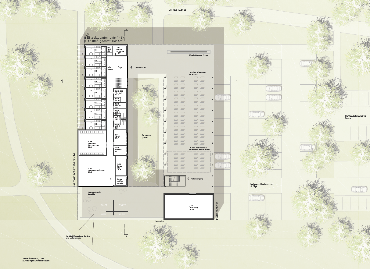 Es wurde ein kompakter, wartungsarmer, zeitloser Baukörper erwartet, welcher auch langfristig den Ansprüchen an preisgünstigen, studentischen Wohnraum erfüllt.