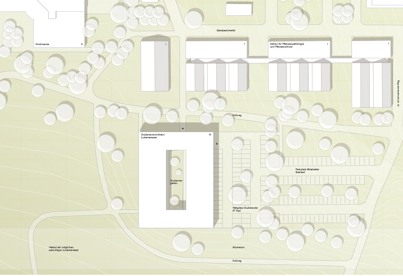 Das Studentenwerk Göttingen plante im Nord Bereich der Universität Göttingen den Neubau eines Studierenden-Wohnheims für ca. 200 Bewohner in Einzelappartements (≤ 19m²) mit Pantry und Nasszelle. Das Grundstück hat eine Größe von 4.467 m², weist eine leichte Hanglage mit unverbaubarem Blick auf das Luttertal auf.